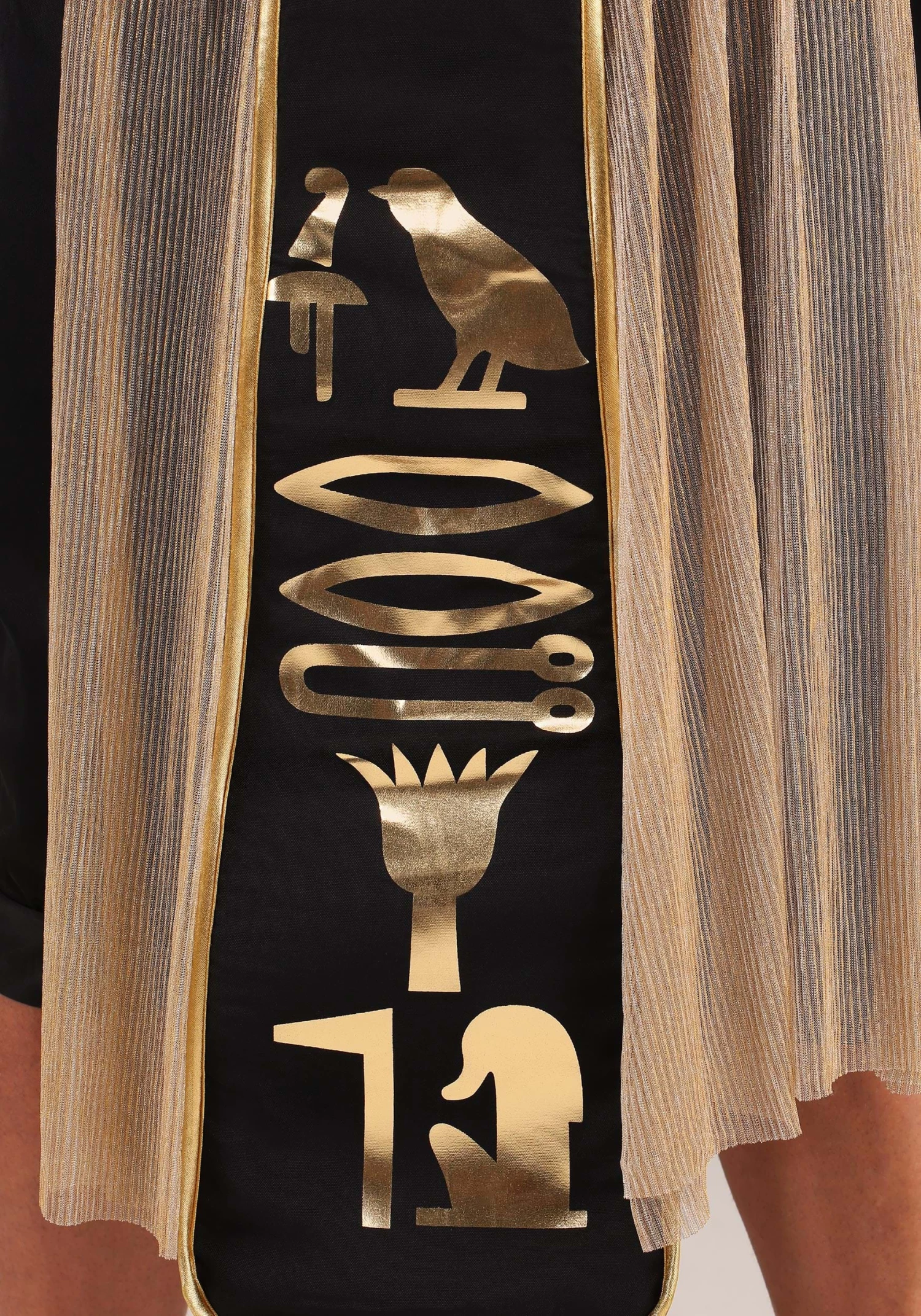 Our costume designers pulled out all the stops on this high quality outfit! This men’s Egyptian style costume brings you the look of an ancient king, complete with a black bodysuit, belt and wrap. The pieces have shimmering gold accents to give you a regal look that will make any subject feel your awesome might. The belt even has golden hieroglyphics on it for added effect. Of course, no pharaoh costume would be complete without some great accessories, so this one comes with a cape, some gold armbands and a luxurious headpiece that looks like something that King Tut would wear. What else could a king ask for (except complete and total subservience from his servants)?