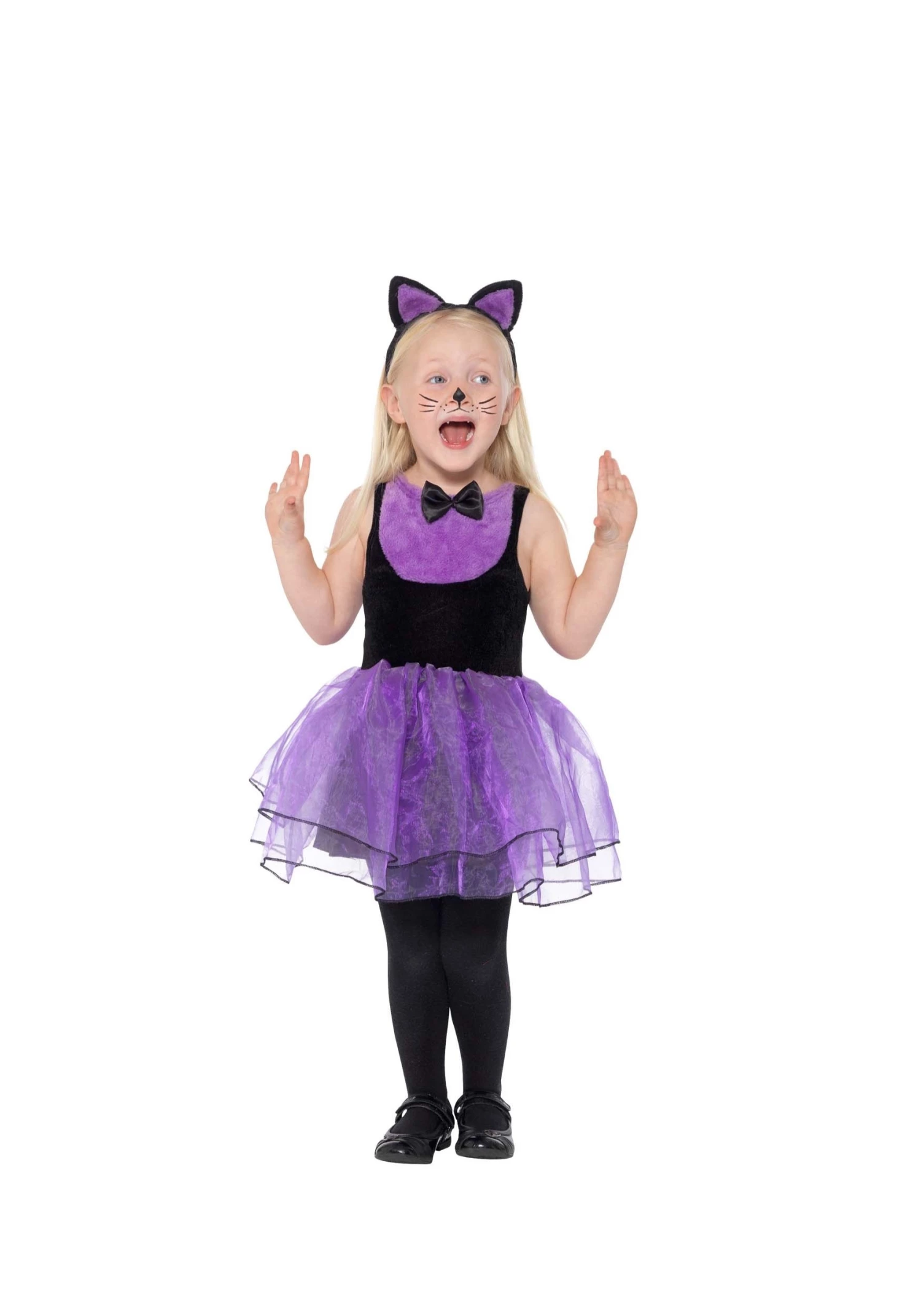 To achieve the full look that’s pictured here, add black stockings and black shoes to the costume. Take a black makeup pencil and draw a nose and whiskers on your little one for a look that’s paw-sitively adorable.